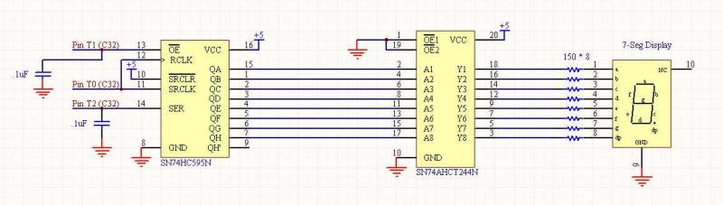 We planned to use SPI to communicate to the C32 board, on which we had many unused ports, so that we could drive a 7 segment display to indicate various messages as we debugged our robot, so that we would not always need to be connected to a tether to know what was going on. While it worked, we never used this feature, because we were always connected to the tether and that was not problematic. The circuit uses a shift register, so that only 3 ports are needed to control 7 segments. The next stage is a buffer that sources the current to drive the 7 segment display.