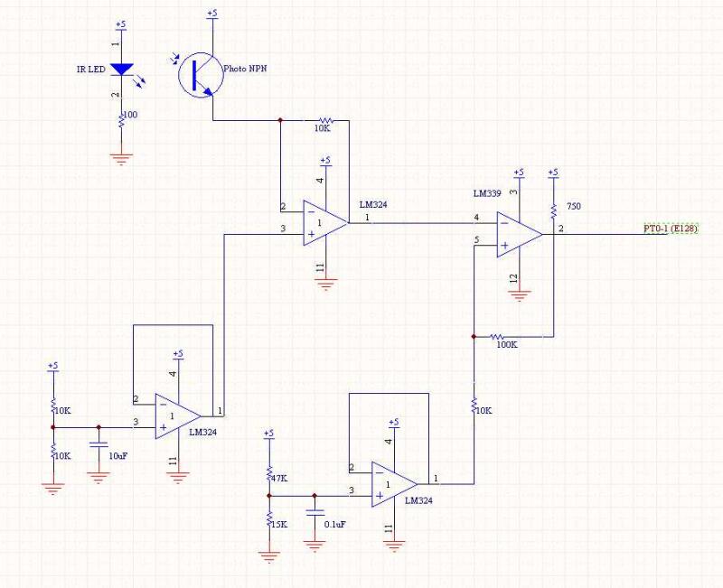 We attempted to use encoders on the drive motors to allow us very accurate absolute movement on the field, to compensate for uneven distribution of flags in our catcher, and to provide more power if pushing against another robot or having a corner stuck on a wall. The encoder circuit consisted of a transresistive stage to amplify the signal, which resulted in a clean signal with distinct rise and falls. As the output signal was centered around 1.25V, we used a comparator with slightly broader hysteresis bands centered at 1.25V to create a signal that then went to an input capture on the E128.
