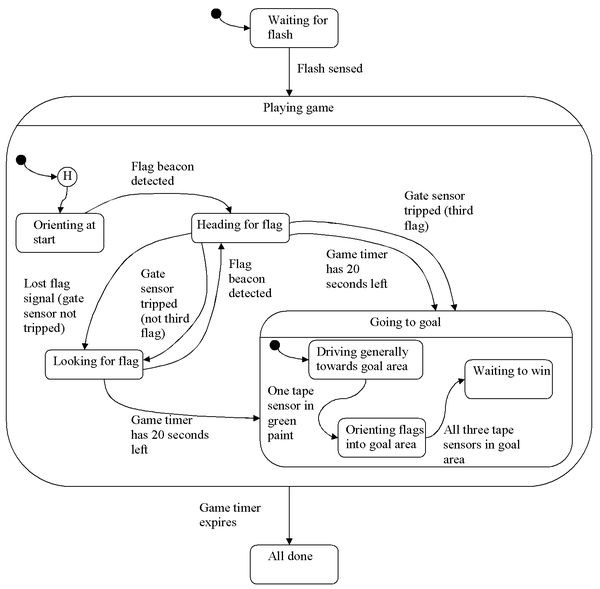 We implemented our strategy using a state chart. The master state machine is responsible for starting the robot at the flash, and stopping it once two minutes elapses. The game playing state machine deals with finding and getting the flags, keeping track of how many flags have been captured, and going to the goal zone when three flags have been captured or time is running out. There is a separate state machine for going to the goal because of its complexity. This state machine guides the robot in the rough direction of the goal, and then lines it up more precisely once the robot had hit the goal zone paint.