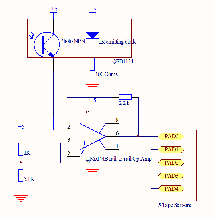 The tape sensors (PhotoNPN) incorporate a simple trans-resistive stage to allow for a linear input current-to-voltage response from the Photo NPN. The reference voltage is set at 4.2 V, sufficiently low to forward bias the PhotoNPN while allowing for a large band (from 0V to 4.2V) of output voltages. The gain resistor, set at 2.2K allows for the optimum separation between the white, black and green tape that is necessary to sense for the game. Each output from the trans-resistive stage feeds directly into an AD port on the E128 and software controlled.