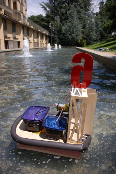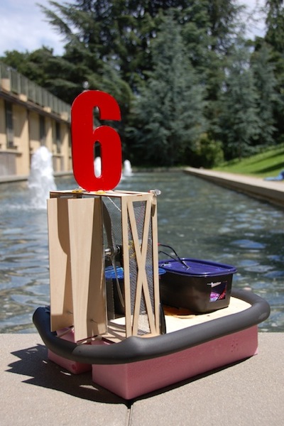 The TOWRP is a fan boat. Two foam runners provide flotation, and the fan is mounted so that thrust is directed over the stern of the boat. The fan is enclosed in wire mesh for safety. Steering is accomplished by the use of servo adjusted vanes to direct the airflow sideways. Tupperware is used to protect the electronics from water, and a cooling fan is built into the side of a tupperware container to cool the motor driver, which runs at close to 20A.
